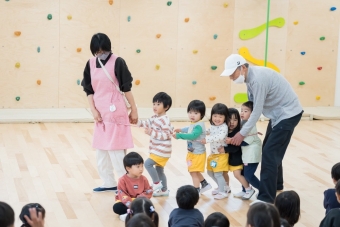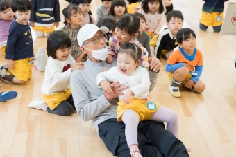 桂幼稚園の元園長の大里先生と歌ったり踊ったり絵本を見たり・・・ゆったり大里先生ワールドに浸ることのできる「大里せんせいとあそぼう!」がありました。年中・年長さんは昨年も会っている大里先生の姿を幼稚園に見つけると「おおさとせんせ~い!」「おおさとじ~じ~」と声があがります。年少さんは初めての大里先生にちょっぴりドキドキしていましたが、すぐに仲良しになっていました。