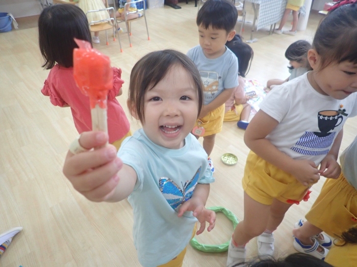 6月に入り、桂まつりが近づいてきました!年少クラスでも輪投げや魚釣りをしてお祭りごっこを楽しんでいました。そんな中、年中さんのお祭りごっこに遊びにいきました!たこ焼き屋さんや飴やさん、焼き鳥屋さんなどたくさんのお店にテンションUPなお子さま達。早速お店屋さんのお兄さんお姉さんに「お肉くださーい!」と元気いっぱいに注文したり、買ってきたたこ焼きや飴をおいしそうに食べる真似っこをして大満足♪食べ終わると「おかわりしてこよ~っと」と何度も買いに行くお子さまもいました♪桂まつり当日はどんなお店屋さんがあるかな?とお祭りをとても楽しみにしている様子でした。
