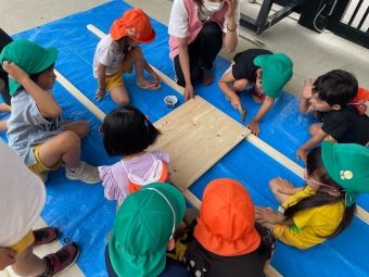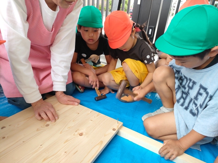 おみこしの土台を木で作るべく、みんなで釘打ちに挑戦しました。保育者が釘打ちを準備していると、「何やってるのー?」「私もやりたい!」とどんどんつちやまさんが集まってきてくれました。釘打ちは力加減が難しく、叩く力が弱すぎると釘が木に入って行かないため、「難しいよー」「全然できない」と始めは釘打ちに少し苦戦している様子のつちやまさんでしたが、コツを掴むと釘がどんどん入って行き、とっても嬉しそうな表情を浮かべていました。「まだやりたい!」「もう1本打ってもいい?」と釘打ちに夢中なつちやまさんでした。