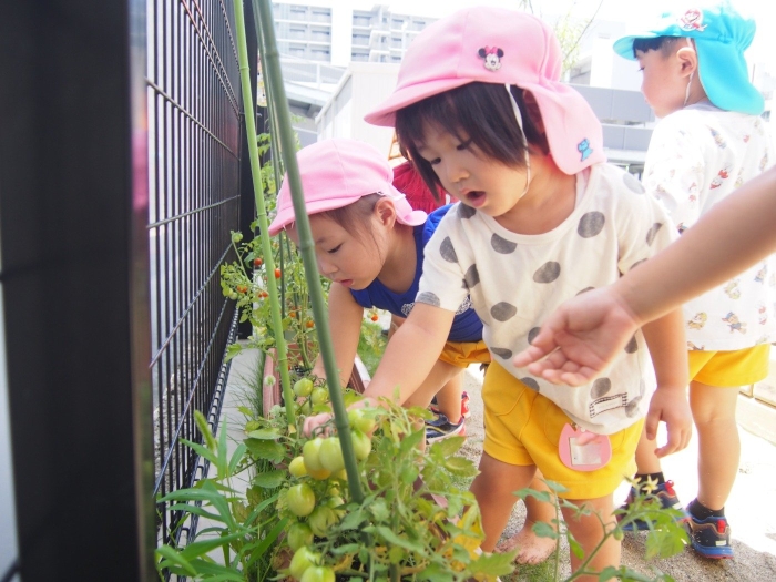 5月に植えてから水やりをして大切にお世話をしてきたミニトマト。黄緑色から日に日に色が赤くなる様子を見て楽しみにしてきました。先日いよいよ赤く色づいたので早速収穫をすることに♪「トマトだいすき!」「早くたべたい~」とわくわくなお子さま達。収獲したトマトはみんなで給食の前に食べました。「おいしね!」「すっぱーい!」「もっとたべたいな~」という声がたくさん聞こえてきました。中にはトマトが苦手なお子さまもいましたが、一口だけ挑戦して食べることができました♪また引き続きみんなで育てていきたいと思います!