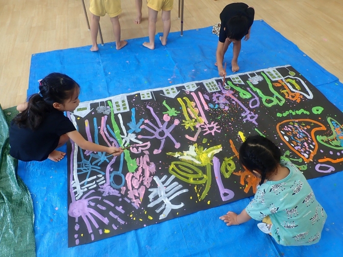 夏休みが明けて夏の思い出を聞くと、「花火大会に行ったよ!」「ばあばとじいじと花火した」と花火の話を聞かせてくれたお子さまがたくさんいたのでみんなで花火を描くことにしました!好きな色の絵具を使って大きな黒い紙に描いていきます。「ピンクの花火にする♪」「お母さんのお顔の花火描く」「ハートの花火見たよ」と見に行った花火大会の花火を思い出しながら描いたり、自分のオリジナル花火を描いたりしていました。また、筆に多く含んだ絵の具が画用紙に飛び散り「わー!綺麗!」と嬉しそうに指さし、それを見た周りのお子さまも一緒に筆を振って花火のぱちぱちと飛び散る様子を表現していました。他にも色の混ざりを楽しんで描くなど個性あふれる花火の絵が完成しました☆完成した絵は廊下に飾って見て楽しんでいます。