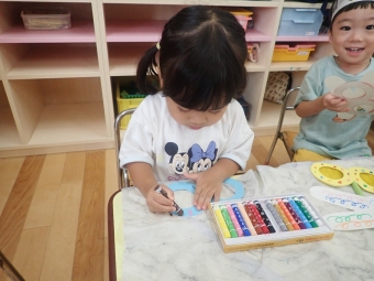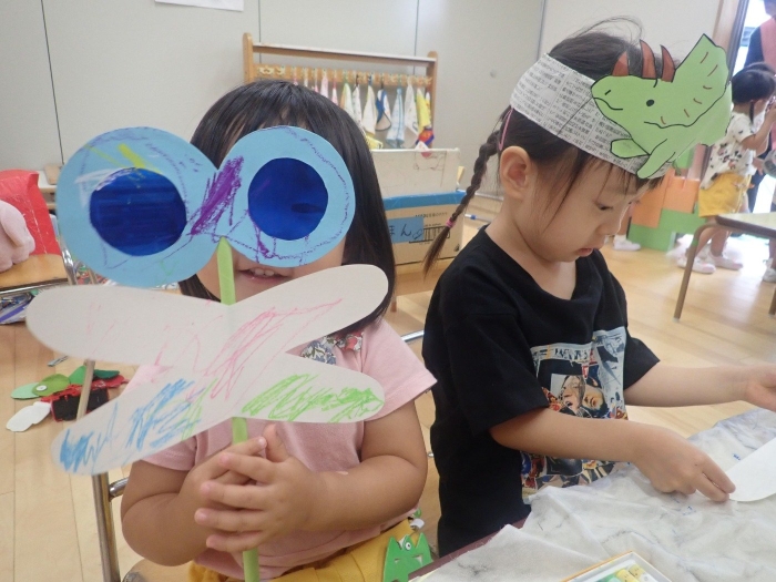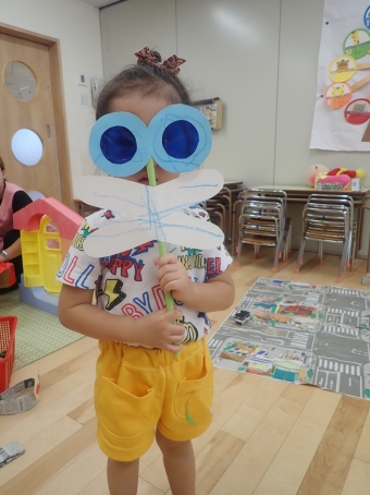 部屋で“とんぼのめがね”の歌を歌っているので水色・黄色・赤色から好きなめがねの色を選び、選んだめがねと羽をクレパスで模様を描いて棒に付けたら完成です。てんてんや波の模様を描く子や一色で塗りつぶす子等それぞれ個性が出ていました。めがねはカラーセロハンを使用しているので覗くと色の世界が広がって見えます。「先生の顔が赤色だ!」「おもしろい!」「頭にくっついた!」と完成したとんぼを大切に持ってお散歩をする可愛いお子さま達でした。