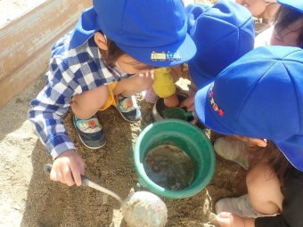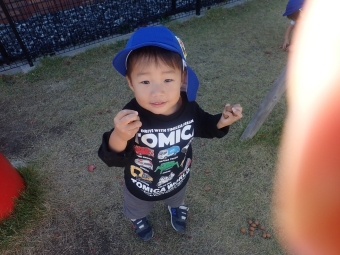 戸外でお気に入りの三輪車に乗ったり、砂場で芋ほりごっこをしているとシラカシの木の下でたくさんのドングリを発見!「ドングリだ!」「このドングリ音が鳴る!」とドングリ集めをしたり、砂場に運んでお料理をすることを楽しんでいました。