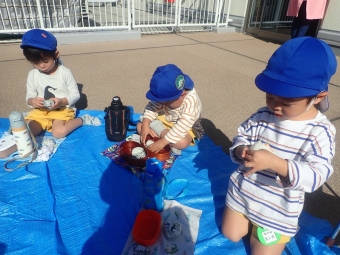 探検が終わるとお待ちかねの“おむすびタイム”の時間です。2階のテラスに上がり、気持ちが良いお日さまの下でお家の人が作ってくれたおむすびを食べるお子さま達から笑顔が溢れていました。
