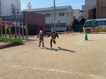 2/13(月)年少さんと一緒に園庭で遊びました!初めに『ジャンボリミッキー』と『ラーメン体操』をみんなで楽しく踊った後『手つなぎリレー』を行いました。ルールは全体を4チームに分け、年長と年少でペアを作って手を繋ぎ行うリレーです。リレーは白熱し、同じチームのお友達を「がんばれ~!」と応援する姿や年少のお友達に「こっちだよ!」と優しく手を引いて走る場所を教えてあげる姿が見られました。次は『手つなぎ鬼ごっこ』。通常の鬼ごっこと同じく、鬼から逃げるルールですが、タッチされたら鬼と手を繋ぎ、逃げている友達を追いかけます。こちらもとっても盛り上がり、にこにこ笑顔のお子さまの姿を見ることができました。