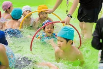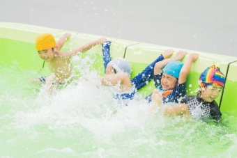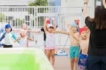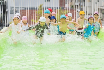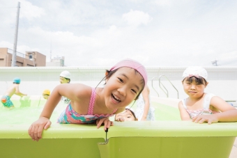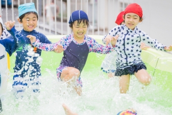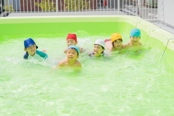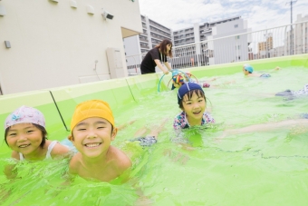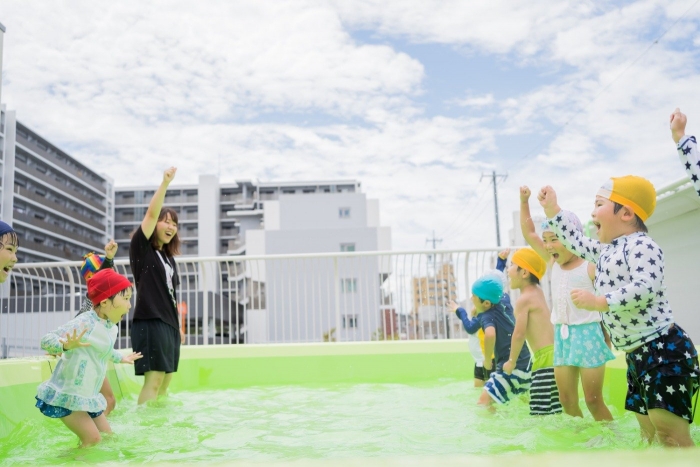 夏の間、屋上に大きなプールが登場し、子ども達は水遊びをたっぷり楽しみました🌞