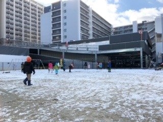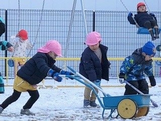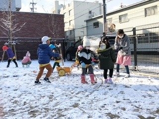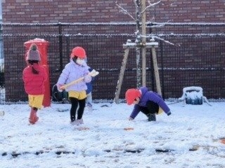 雪だるまを作ったり、雪合戦をしたり、スコップで雪をすくい雪山を作ったりしてひと時の雪あそびを楽しみました。
