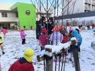 昨夜から降っていた雪で幼稚園の園庭がうっすら白くなりました。
