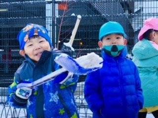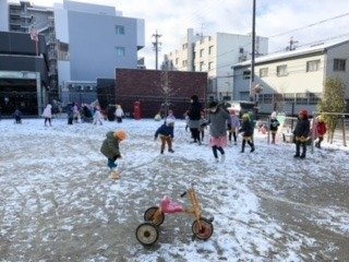 幼稚園に着いた時にはもう雪が解けいるのでは・・・と心配だった遅バス登園の子ども達には、日が当たらず雪が残っていた2階テラスで雪あそびをしました。