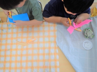 真剣な表情ではさみに挑戦!「こえかけないでね!」(年中)