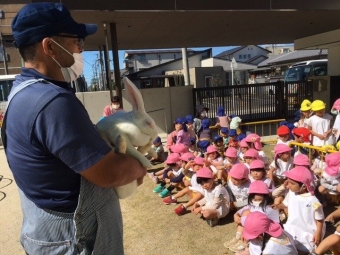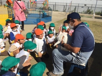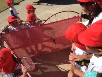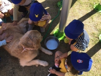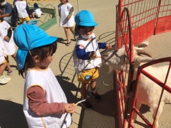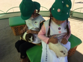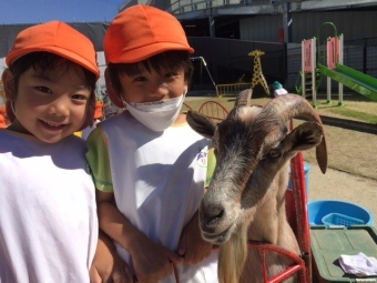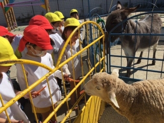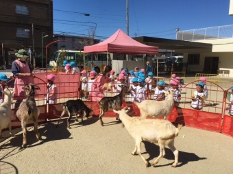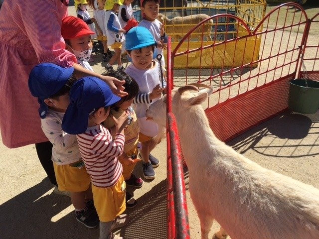 桂幼稚園の園庭におおきな赤いトラックが到着!トラックの中からかわいい動物たちが下りてくると「わ~いぬだ~!おおきい!」「つぎはやぎさんだよ!」と登園して来るなり大興奮のお子さま達。動物たちの準備ができて、さあ!いちご動物園のオープンです🐏動物園のお兄さんに抱き方や撫で方、えさのあげ方を教えてもらい、いざ動物さんたちの所へ。学年ごとに時間を分けて、クラス単位でいろいろな動物を回りました。