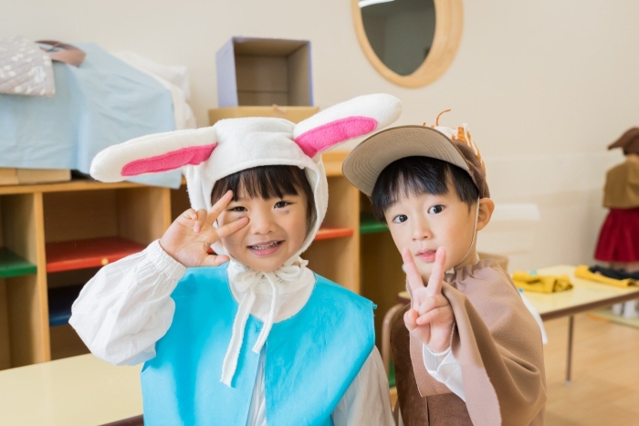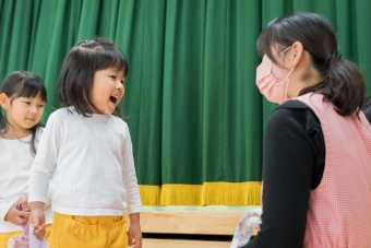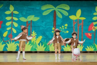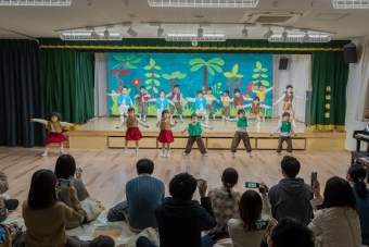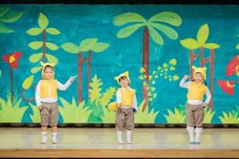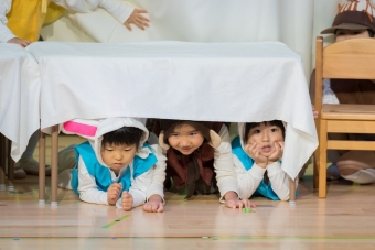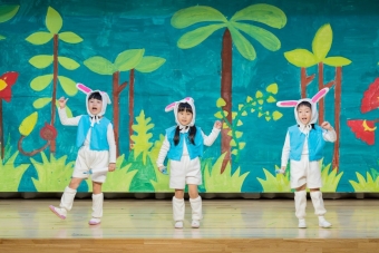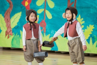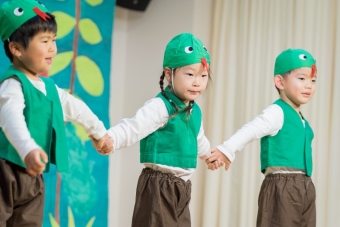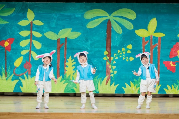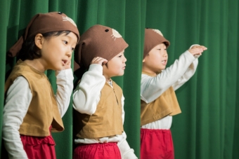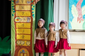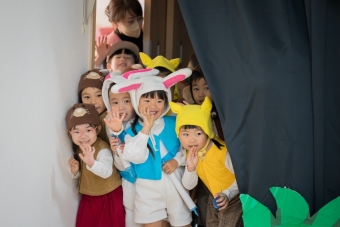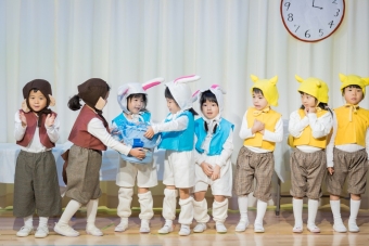 年少さんに続き生活発表会を行ったのは年中さん。リハーサルの時から大きな声で張り切っていた年中さんはたくさんのお客さんの前でも自信を持って自分たちの役を生き生きと演じることができました。年中さんの劇は「くすのきだんちは10かいだて」という絵本を題材にしました。くすのき団地に住むかわいい住人(動物たち)が繰り広げる楽しくそしてへびさんの登場によりちょっぴりスリルもあるお話になっています。元気いっぱい演じる年中さんをちょっぴりご紹介します。
