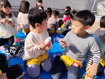 とても暖かい日でしたので年長クラスは園庭・年中クラスは2階のテラス・年少さんは遊戯室・うみ組さんはお部屋にシートを敷いて、ピクニック気分でいただきました。ご家族の愛情いっぱいのおむすび、ありがとうございました。